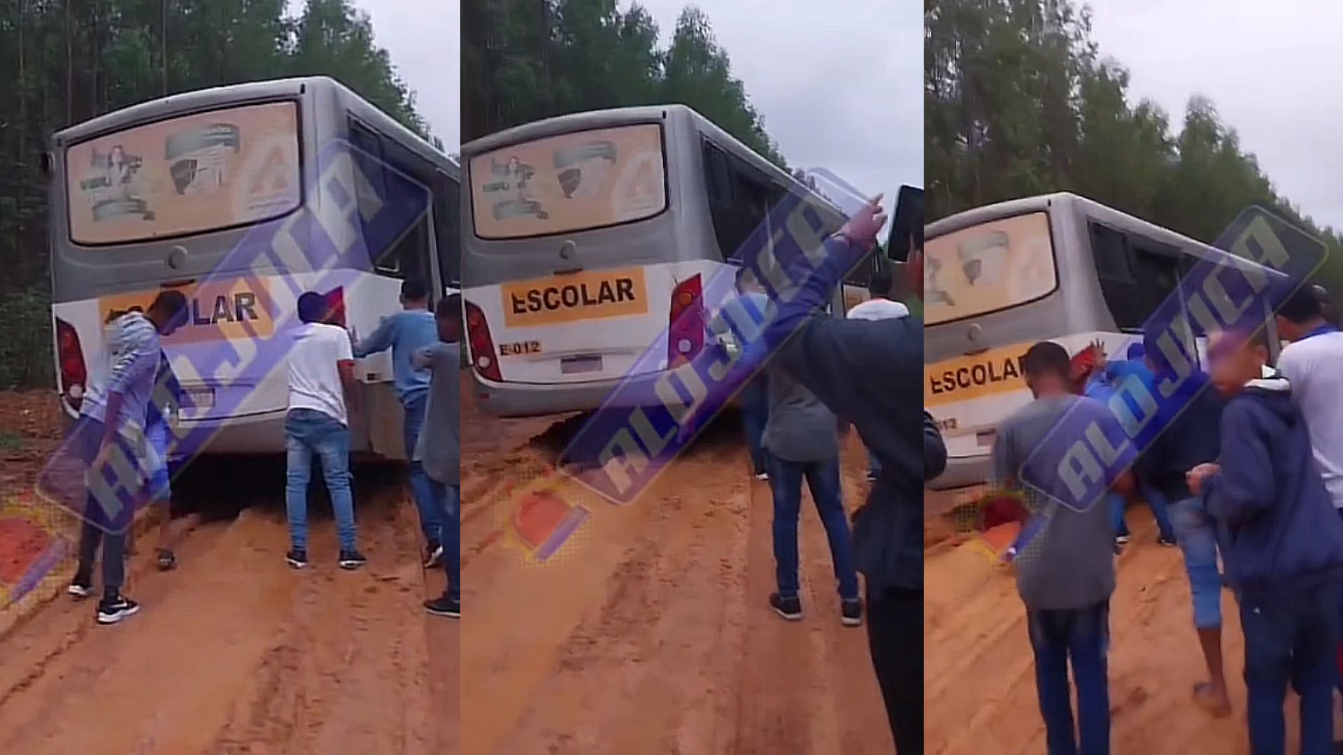 Em imagens enviadas ao site Alô Juca, é possível ver os estudantes tentando empurrar o veículo que estava atolado em uma estrada de barro que está intransitável.