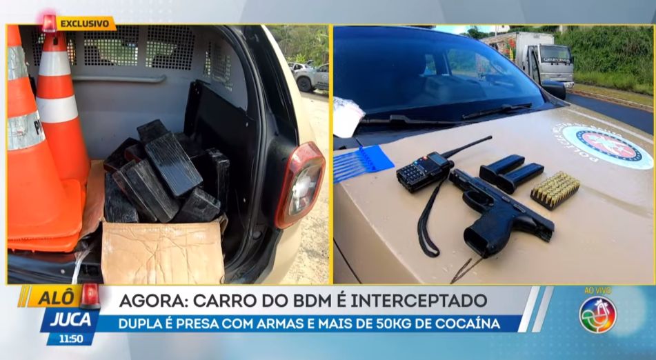 Uma blitz realizada pelo 22º Batalhão da Polícia Militar resultou na interceptação de um carro ligado à facção BDM (Bonde do Maluco), na Avenida Dois de Julho, que liga Bairro Cajazeiras a BR-324, nesta sexta-feira (25). Dois homens foram presos em flagrante com mais de 50 kg de cocaína e uma pistola calibre 380.