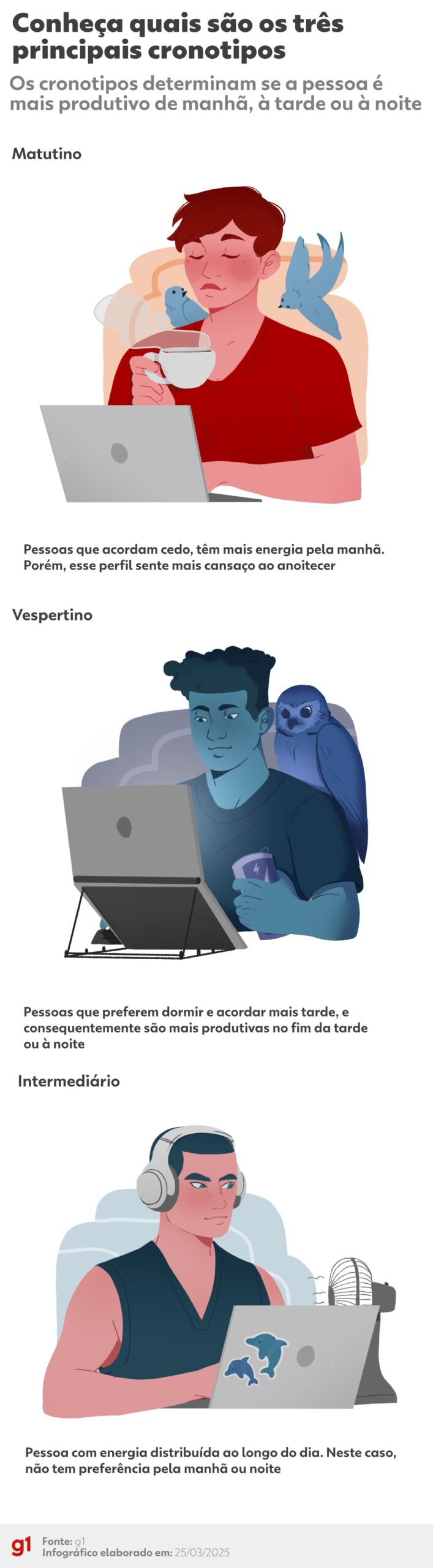 Ou seja: os cronotipos determinam se alguém é mais produtivo pela manhã, à tarde ou à noite.