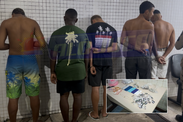 Na ação, dois suspeitos foram detidos em via pública e outros três foram encontrados escondidos em uma construção próxima. Com eles, os policiais apreenderam uma quantidade significativa de entorpecentes, incluindo porções de cocaína, maconha e crack, além de aparelhos celulares, dinheiro em espécie e outros materiais relacionados ao tráfico de drogas.