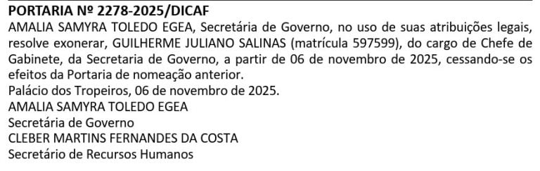 A prefeitura, comandada interinamente pelo vice Fernando Martins Costa Neto (PSD), não comentou a exoneração.