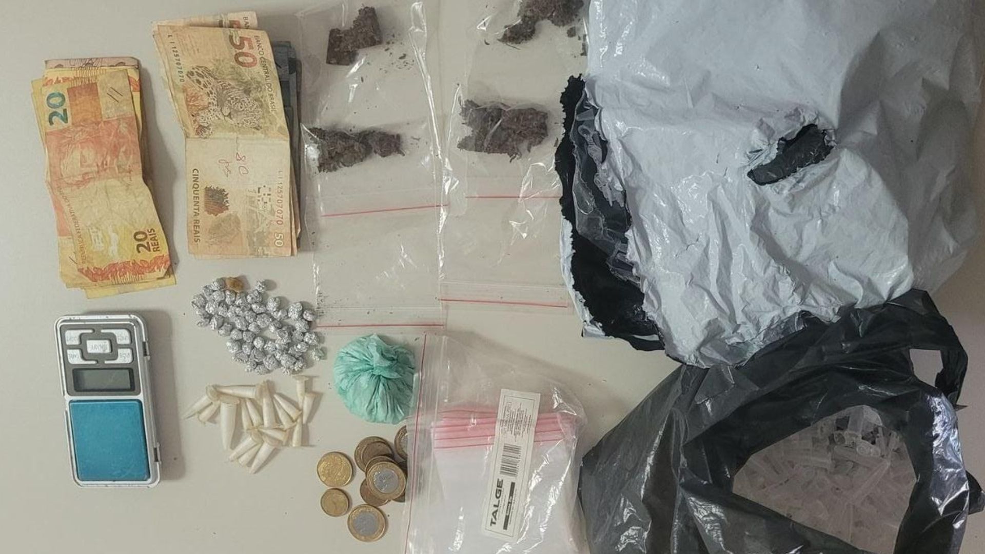 Com as suspeitas, os policiais encontraram um saco contendo diversas porções de drogas, incluindo quatro trouxas de maconha, 51 pedras de crack e 16 pinos de cocaína, além de um saco plástico com mais porções do mesmo entorpecente. Também foram apreendidos R$ 432,50 em dinheiro e uma balança de precisão.