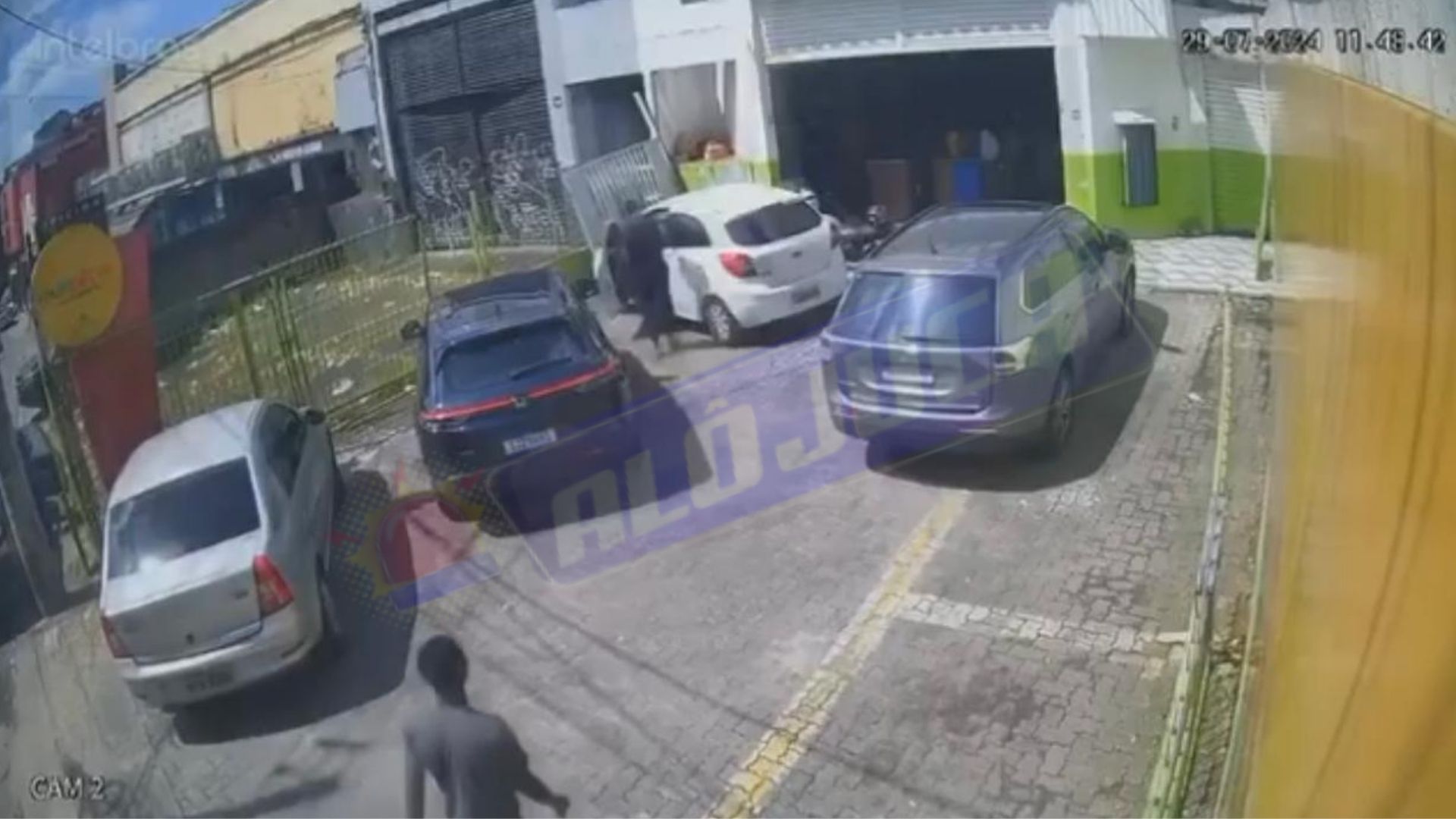 O circuito de segurança do estabelecimento registrou toda a ação e mostra o momento em que os homens aproveitam que a mulher está parada com a porta do veículo aberta e fazem a abordagem. Outro cliente, que também estava no estacionamento, percebe a movimentação e sai com o carro para evitar ser mais uma vítima dos criminosos.