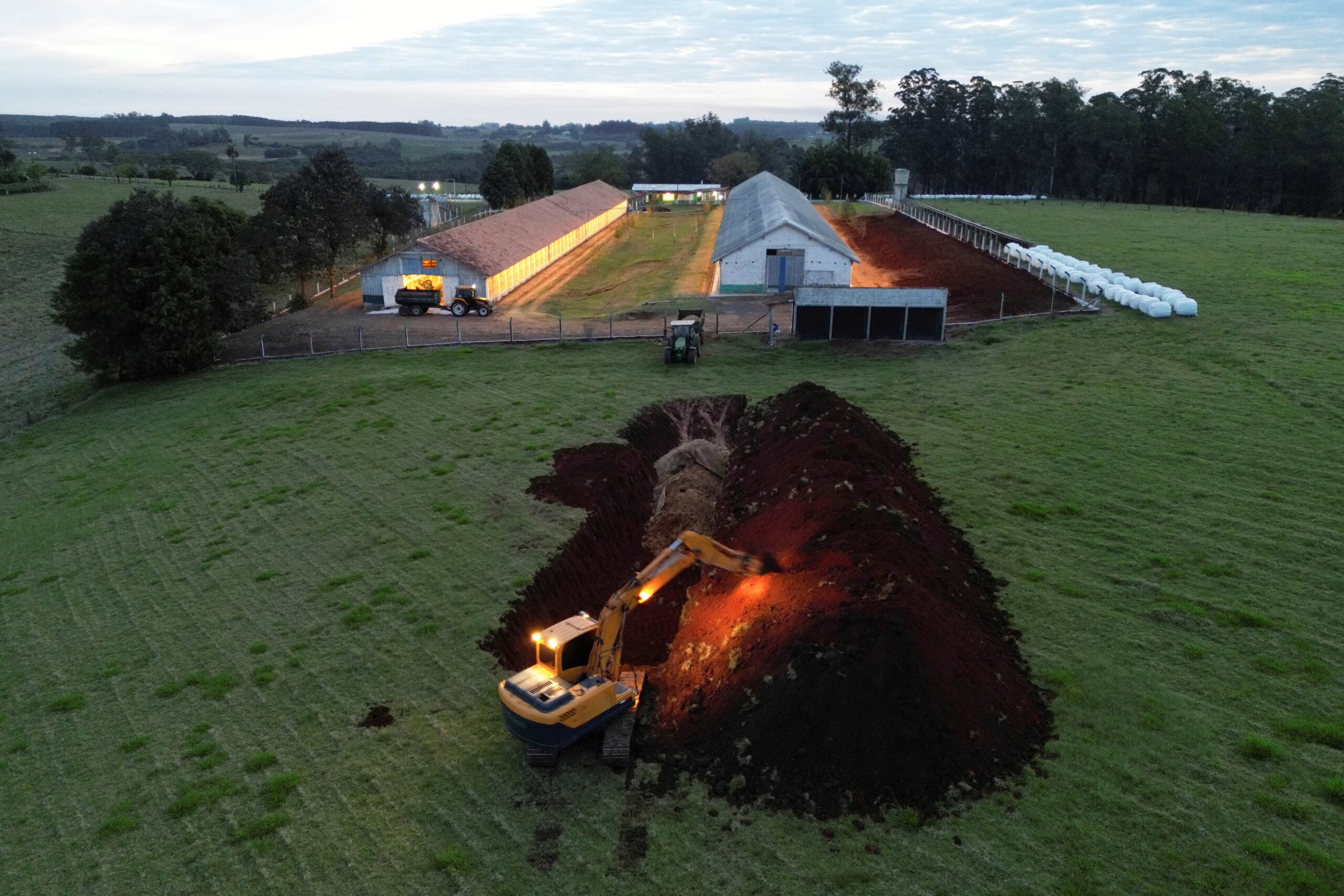 Escavadeira abre buraco em chão de granja avícola na cidade de Montenegro, no Rio Grande do Sul, após a confirmação de caso de gripe aviária.