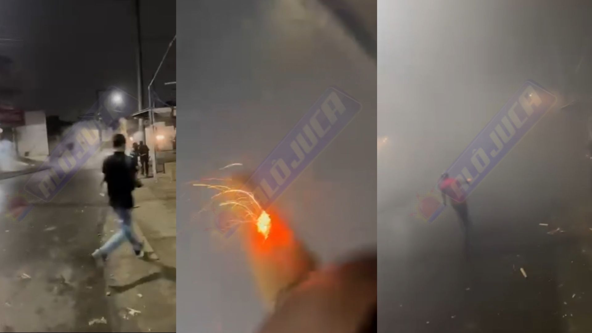 Em um vídeo enviado para o site Alô Juca, é possível ver mais de 30 jovens, jogando rojões em via pública.