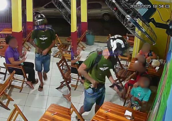 Nas imagens, é possível ver o momento em que a dupla chega ao local, o piloto permanece na moto, enquanto o comparsa desce e entra na lanchonete. O assaltante, usando capacete está armado e aborda os clientes funcionários, roubando os celulares. Após a ação, ele retorna à motocicleta, e ambos fogem do local.