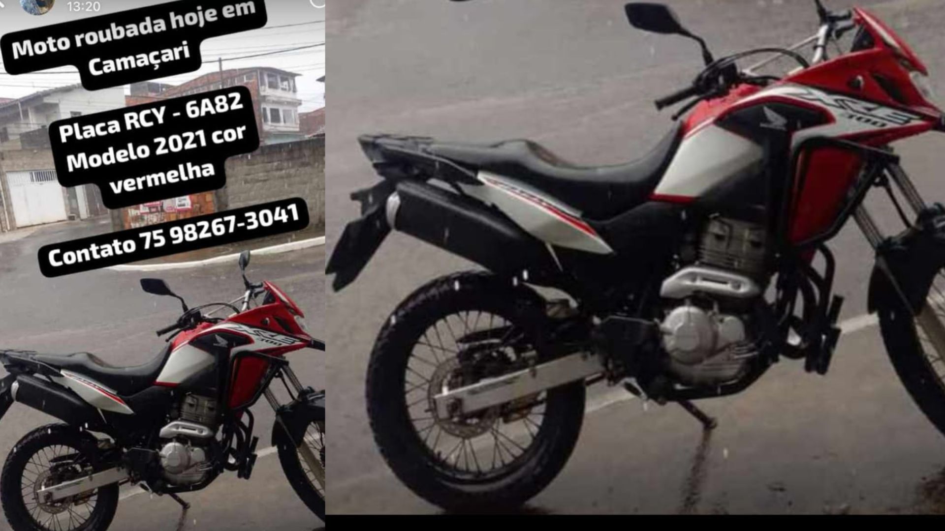 A moto se trata de uma HONDA XRE  vermelha, placa RCY-6A82. Quem tiver informações sobre o veículo, deve entrar em contato com o número (75) 98267-3041.