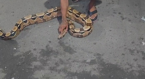 Uma jiboia, de aproximadamente dois metros, foi encontrada por moradores de Cosme de Farias dentro de uma casa, na noite desta sexta-feira (5). Vídeos foram enviados para o site Alô Juca e mostram o animal em via pública.