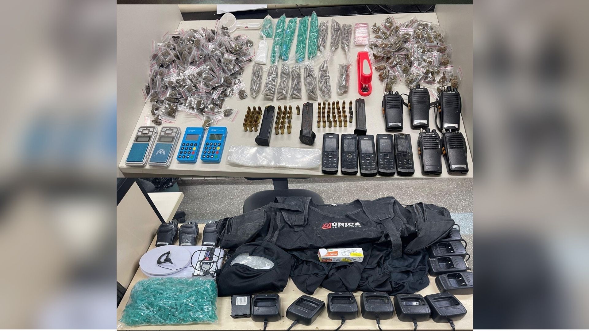 Durante a operação, os policiais encontraram 403 porções de maconha, 391 pinos de cocaína, uma porção de cocaína, um carregador de calibre .380mm, um carregador de calibre 9mm, um carregador de calibre .40mm, duas balanças, duas máquinas de cartão, seis celulares, oito rádios comunicadores, cinco balaclavas pretas, 15 cartuchos intactos de calibre 9mm, 16 cartuchos intactos de calibre .40mm, 34 cartuchos intactos de calibre .380mm, uma capa de colete de segurança, um saco com eppendorf vazios e 11 carregadores de rádio transmissor.