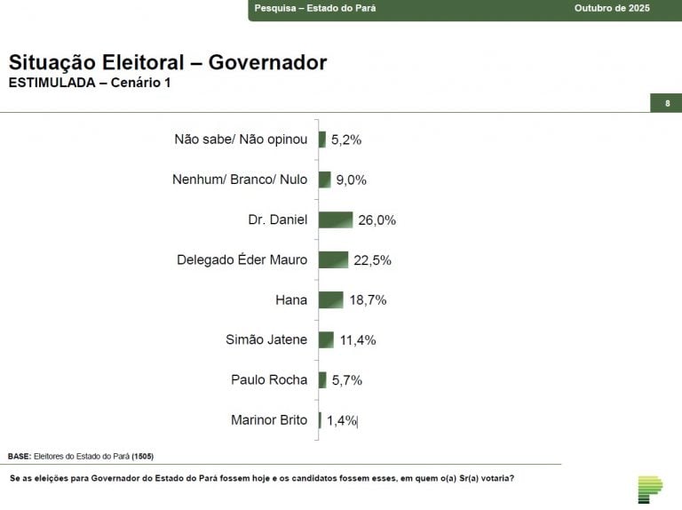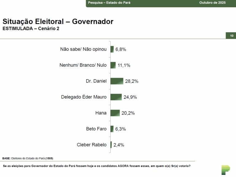 Segundo o levantamento, o prefeito de Ananindeua, Dr. Daniel (PSB), está numericamente na dianteira, com 26% das intenções de voto. Na sequência, aparece o deputado federal Éder Mauro (PL), com 22,5%. Como a margem de erro é de 2,6 pontos percentuais, para mais ou para menos, as intenções de voto entre os dois políticos se esbarram.