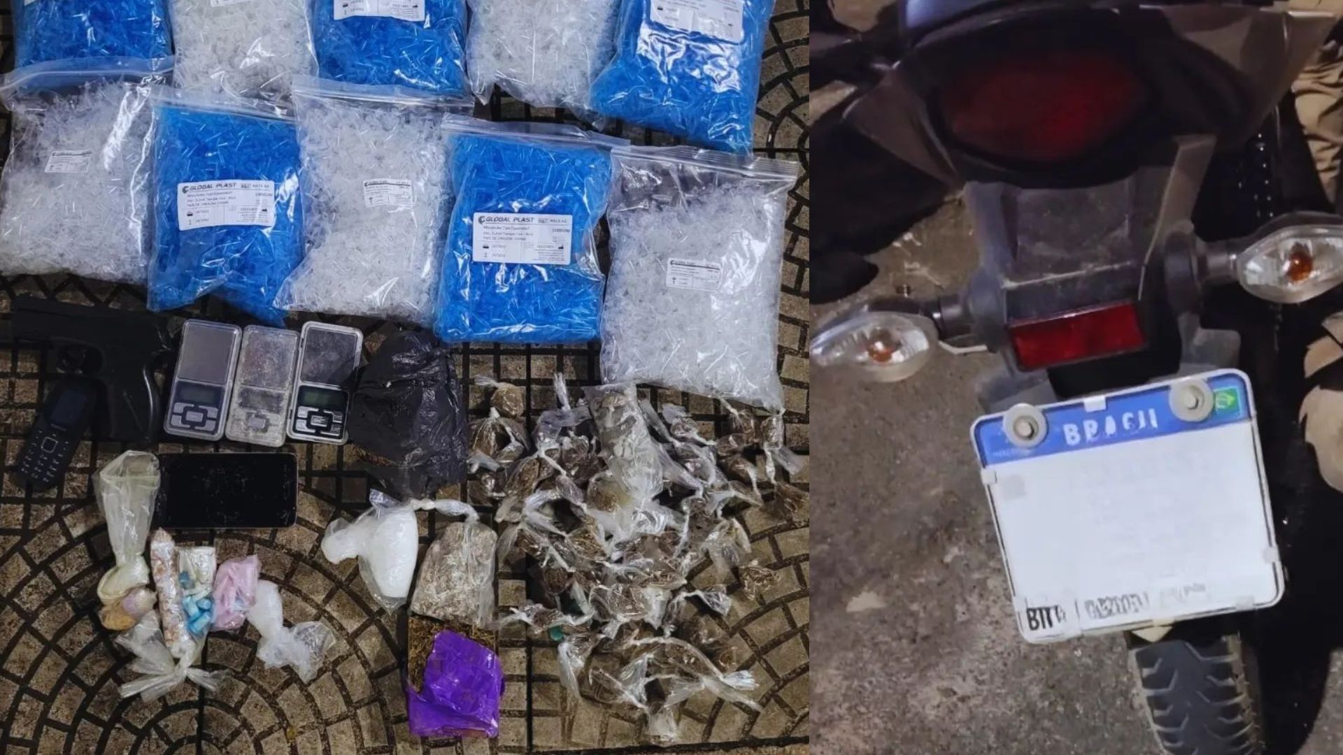 Foram apreendidos, maconha, crack, cocaína, embalagens para acondicionamento de entorpecentes, e balanças de precisão. Na fuga, os traficantes abandonaram uma motocicleta com restrição de roubo.