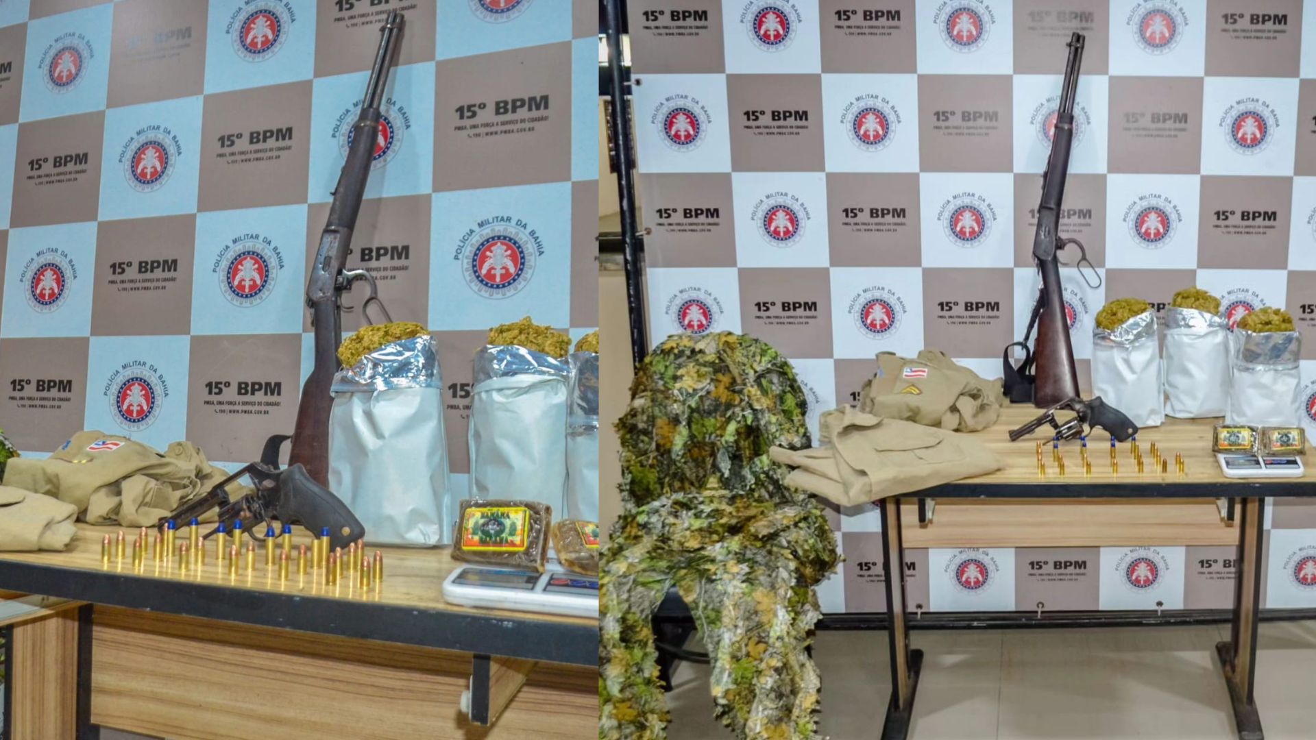 Na localidade, os policiais conseguiram apreender uma carabina, um revólver calibre 38, munições, dois uniformes da Polícia Militar, além de uma roupa camuflada. Foram encontrados também 3 kg de maconha, 200g de haxixe e uma balança de precisão. Todo material apreendido foi apresentado na Delegacia Territorial (DT) de Itabuna.