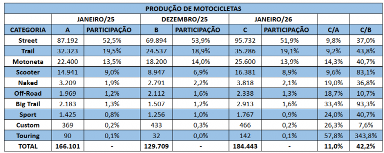 Em janeiro, a categoria Street liderou a produção de motocicletas, com 95.732 unidades e 51,9% do total. Na sequência vieram Trail, com 35.286 unidades e 19,1%, e Motoneta, com 25.600 unidades e 13,9%.