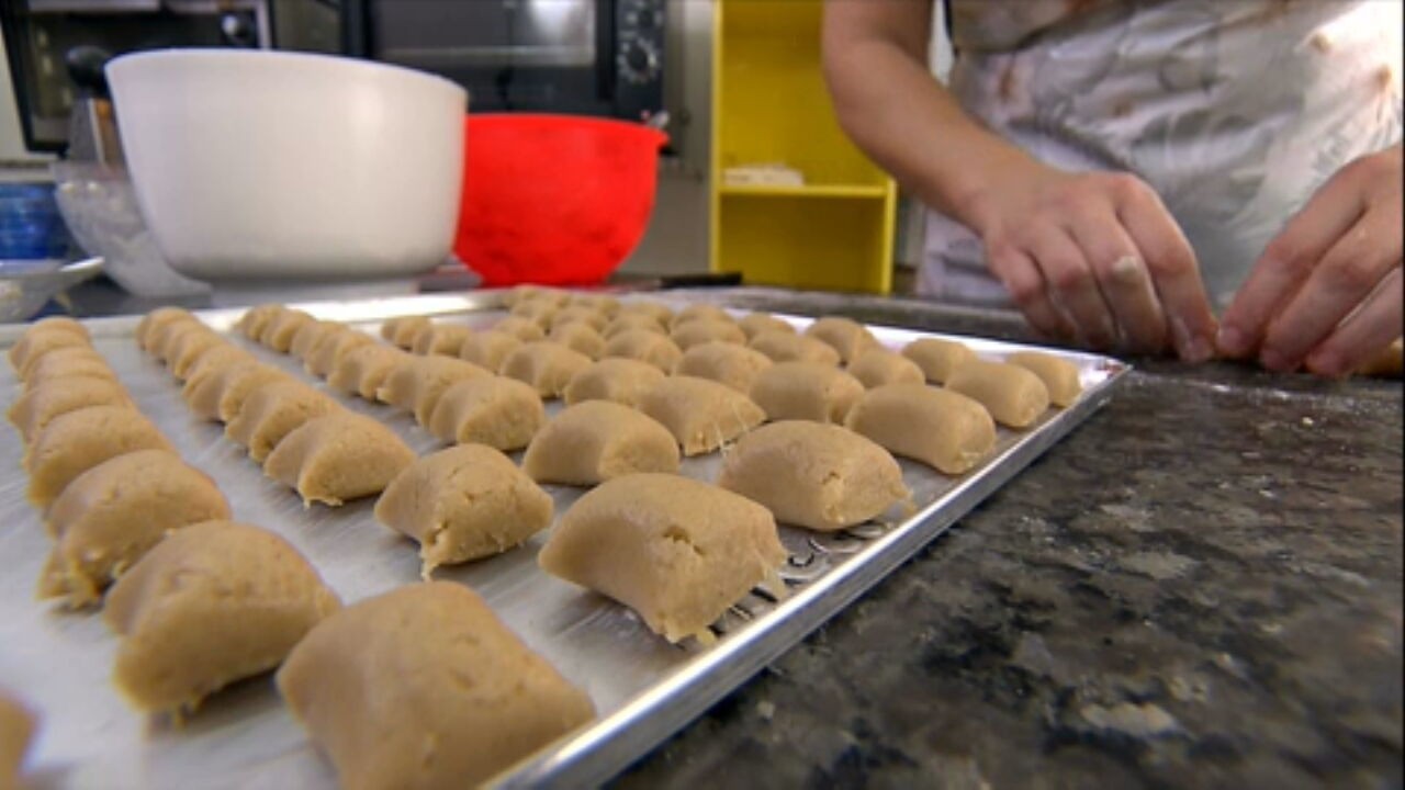 O primeiro passo é ralar o gengibre. Em uma tigela, coloque o gengibre e os ovos, o sal, a canela em pó, a margarina, o açúcar e o fermento. Mexa até ficar bem homogêneo. O amido é colocado aos poucos, pra dar liga à massa. No final, acrescente a farinha de trigo e misture bem.