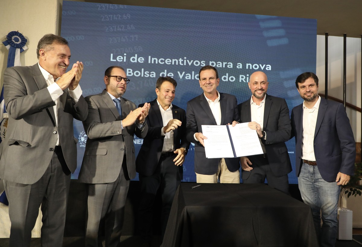 Durante a cerimônia desta quarta, Paes sancionou a lei municipal que incentiva a instalação da bolsa de valores na cidade. A nova legislação propõe a redução do ISS (Imposto Sobre Serviços) de 5% para 2% sobre atividades da bolsa de valores, um incentivo ao retorno do mercado de ações carioca.