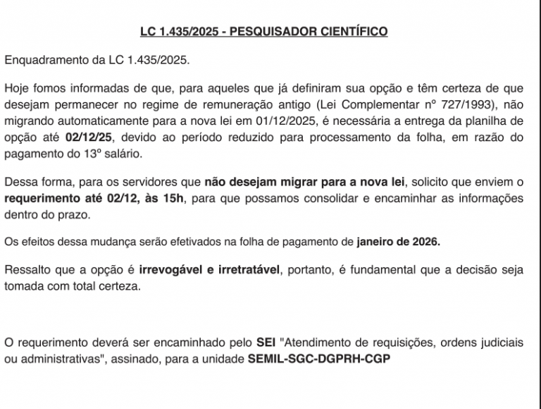 Na prática, os pesquisadores foram colocados diante de uma escolha forçada, com um prazo que a própria lei não prevê. O atropelo contrasta com o texto da LC 1.435/25, que determina um prazo de 90 dias corridos para que o servidor manifeste, formalmente, se deseja permanecer no regime anterior. A escolha é irrevogável e irretratável. Quem não se manifestar automaticamente migra para o subsídio.