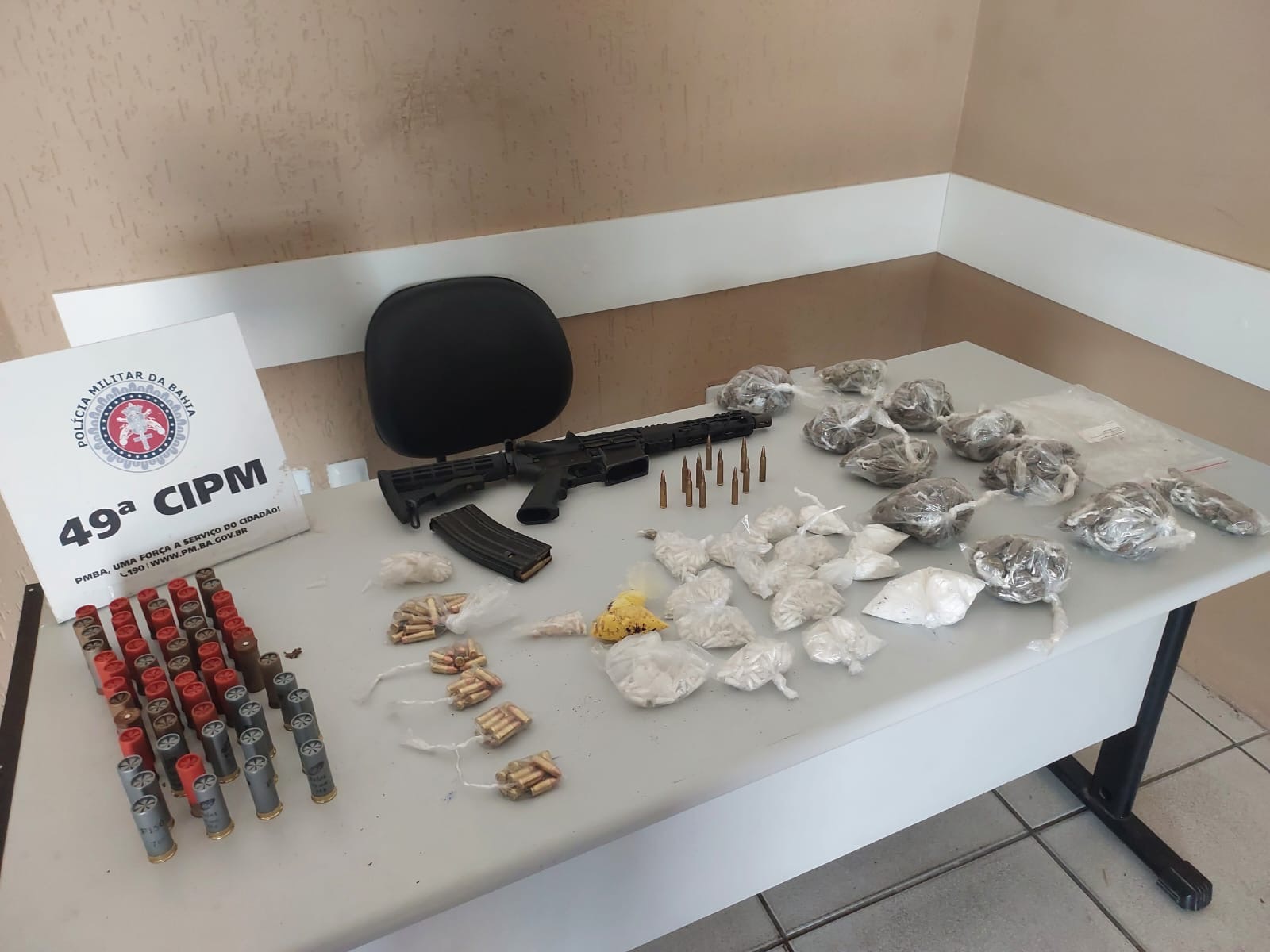 A equipe da 49ª Companhia Independente de Polícia Militar (CIPM) foi atacada por um grupo de traficantes armados na localidade conhecida como Barro Duro, em Salvador, neste sábado (19). De acordo com informações da PM, um dos envolvidos conseguiu fugir, mas deixou cair no chão um fuzil calibre 556, munições e uma grande quantidade de porções de maconha e cocaína. O material apreendido era da facção BDM e foi apresentado na Central de Flagrantes da Polícia Civil, nos Barris.