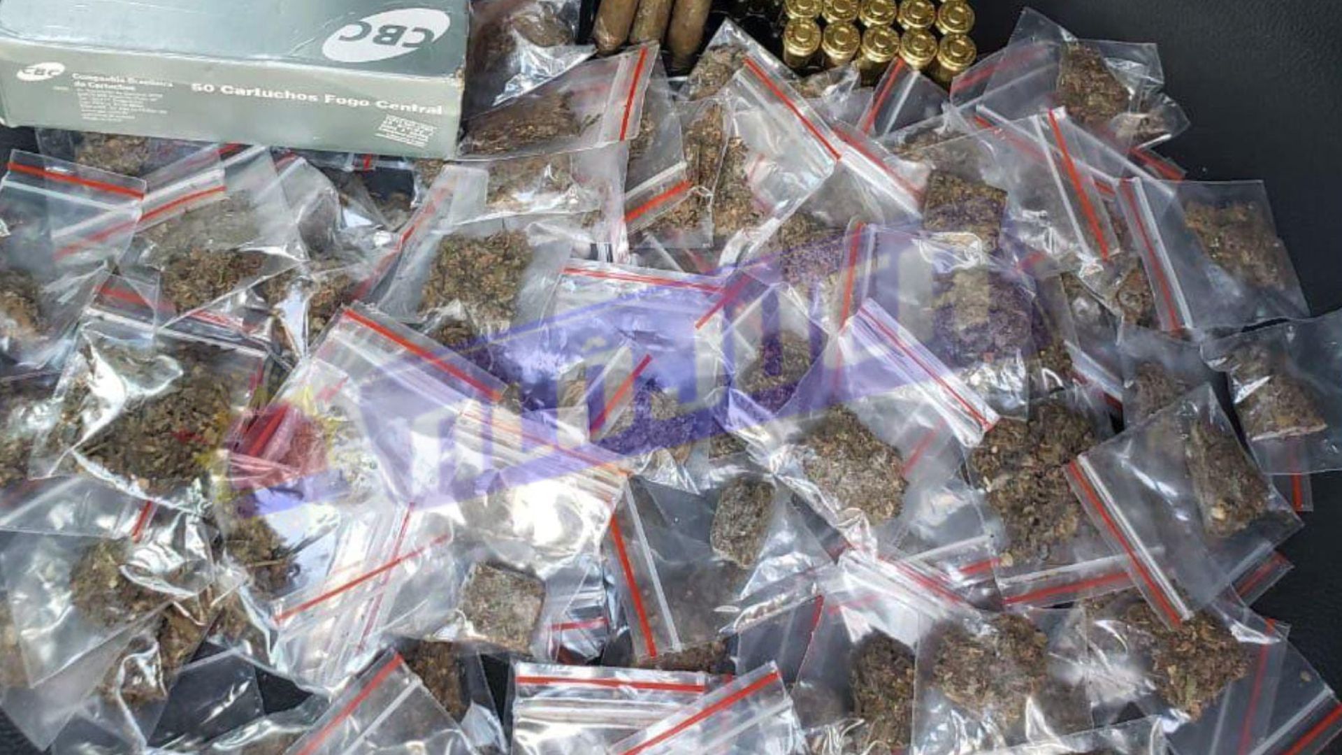 O suspeito foi alcançado, abordado e imediatamente preso. Após buscas, os militares encontraram 104 porções de maconha, 28 munições calibre 9mm, cinco munições calibre 5.56 e uma bolsa. A droga já estava separada e embalada em pequenas porções, pronta para a venda.